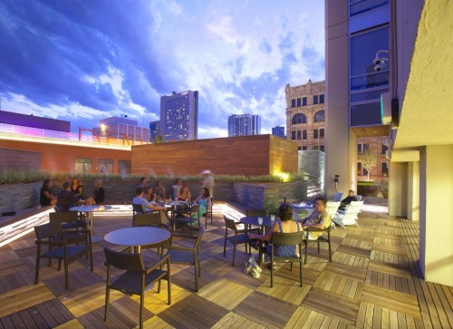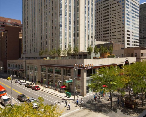 1600 Glenarm Place - a renovation by Davis Partnership Architects, Martino & Luth Structural Engineers, and Hyder Construction. It was originally the Security Life Building in Downtown Denver before being converted to an apartment building in 2006. This building, which houses 333 residential units and 30,000+ square feet of prime real estate, was in need of an amenities area renovation. This renovation included amenity areas on the 2nd and 3rd floors, as well as a new stairs connecting the levels to the main building which doubled as an architectural design feature. Renovation additions for this luxury apartment complex included a movie theater, conference room/business center, rooftop deck, waterfall feature, and fitness area.
