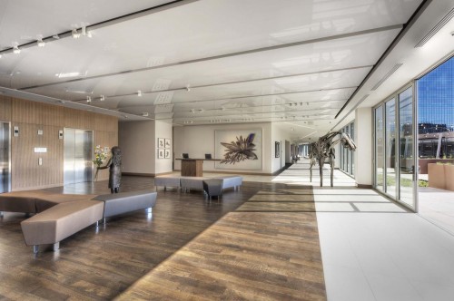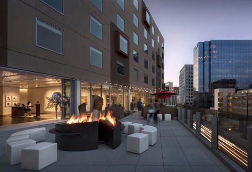 Structurally, the project is unique because it has four stories of light gauge steel bearing wall framing over five stories of composite structural steel framing. This was required because the first four stories are being used for office space and hotel amenities and the upper floors are for hotel rooms. The walls between hotel rooms are light gauge steel bearing walls and they get transferred out at the fifth level to accommodate the open spaces required for offices and hotel amenities.