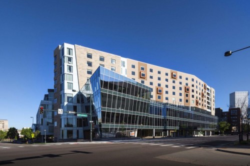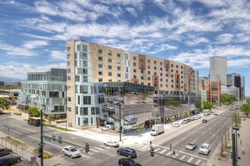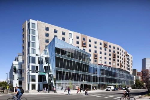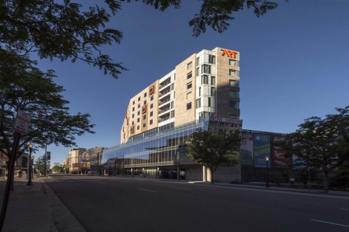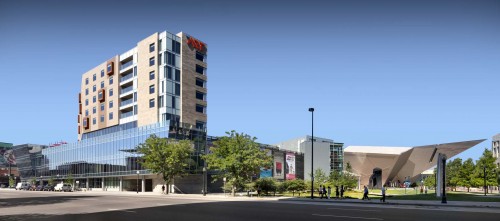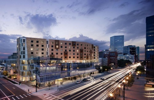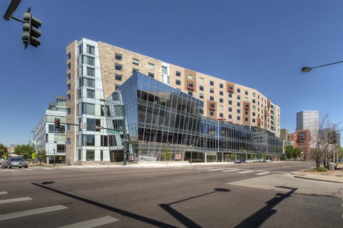 The North-West corner of 12th and Broadway in Denver Colorado is one of the most important corners in the city. Across the street on the East side of Broadway is the History Colorado Center. One block North is the Denver library and the Ralph L. Carr Colorado Judicial Center. However, this corner has been used for a parking lot in recent memory and has detracted from the overall aesthetics of the location. In the past ten years, many developments have been proposed for the site but were not found to be economical due to the site’s awkward shape and the relative remoteness from downtown. Enter Corporex with an idea for a boutique hotel over an office building. If it was going to work, the design team needed to solve several cost and logistics problems