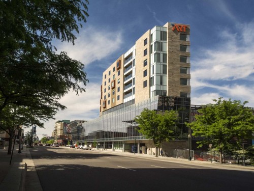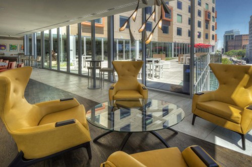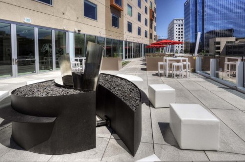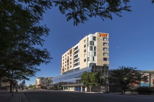Structurally, the project is unique because it has four stories of light gauge steel bearing wall framing over five stories of composite structural steel framing. This was required because the first four stories are being used for office space and hotel amenities and the upper floors are for hotel rooms. The walls between hotel rooms are light gauge steel bearing walls and they get transferred out at the fifth level to accommodate the open spaces required for offices and hotel amenities.